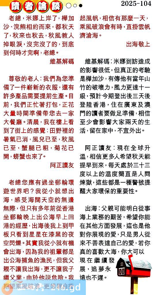 1.老總,米娜上岸了,樺加沙、浣熊相約而來,都秋天了,秋來也秋去,秋風教人掉眼淚,沒完沒了的,到底到何時才完啊,老總。維基解碼