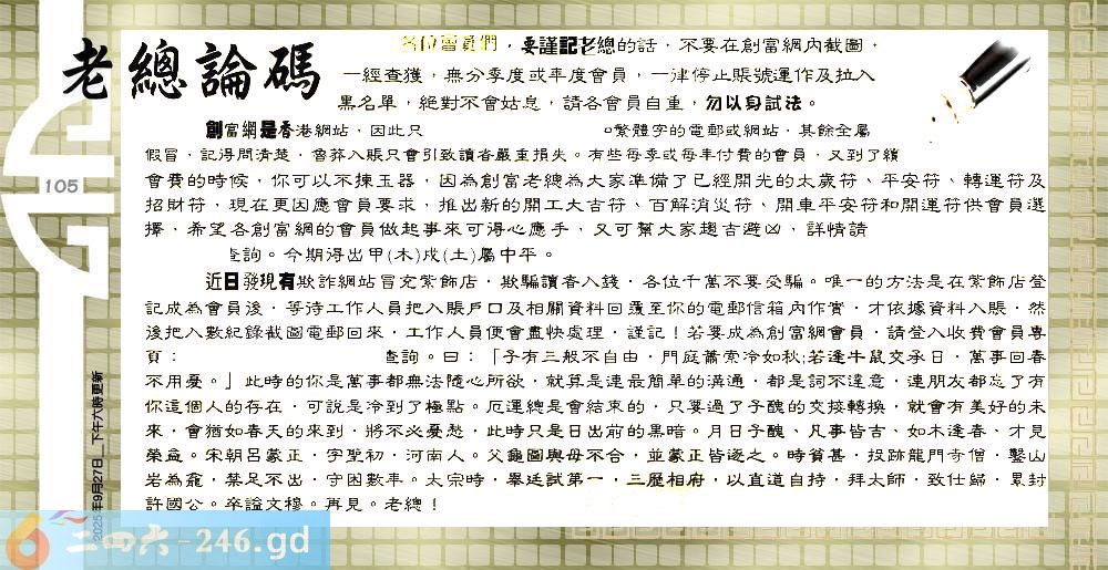 六合彩105期:六合皇金句/老总论码/萧公子/林大师/五行夺码/老总信箱截图