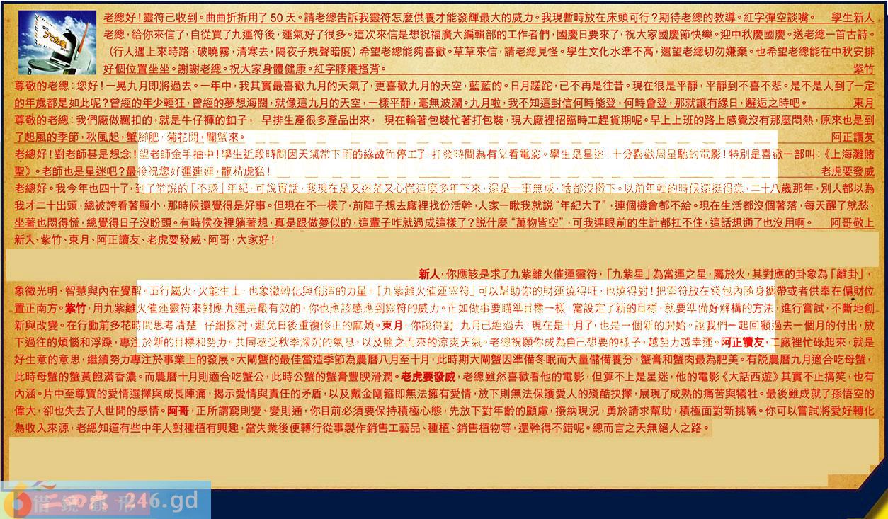 【2】.老總,給你來信了,自從買了九運符後,運氣好了很多。這次來信是想祝福廣大編輯部的工作者們,國慶日要來了,祝大家國慶節快樂。迎中秋慶國慶。送老總一首古詩。(行人遇上來時路,破曉霧,清寒去,隔夜子規聲暗度)希望老總能夠喜歡草草來信,請老總見怪。學生文化水準不高,還望老總切勿嫌棄。也希望老總能在中秋安排好個位置坐坐。謝謝老總。祝大家身體健康。紅字膝癢搔背。紫竹