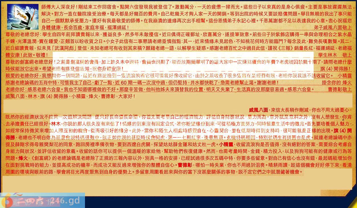 【2】.尊敬的老總您好:學生自四年前拜讀貴報以來,獲益良多,然多年未敢擾信。近日偶得正確郵址,欣喜萬分,遂提筆致意。前些日子於紫飾店購得一串與命理相合之紫水晶手鍊,光澤溫潤,實在鍾愛,正翹首以盼收貨之日。小女子此信有二事懇請老總垂憐指點:其一,近來情緣未見起色,不知桃花何時方能臨門?每念及此,難免長嘆數聲。其二,近日細讀貴報,似未見「武漢阿彪」登信,未知老總可有收到其來稿?願藉老總一語,以解學生疑惑。感謝老總百忙之中過目此信,謹祝《三報》銷量長紅,福運綿延,老總福體安康!此致。敬禮!學生林木敬上