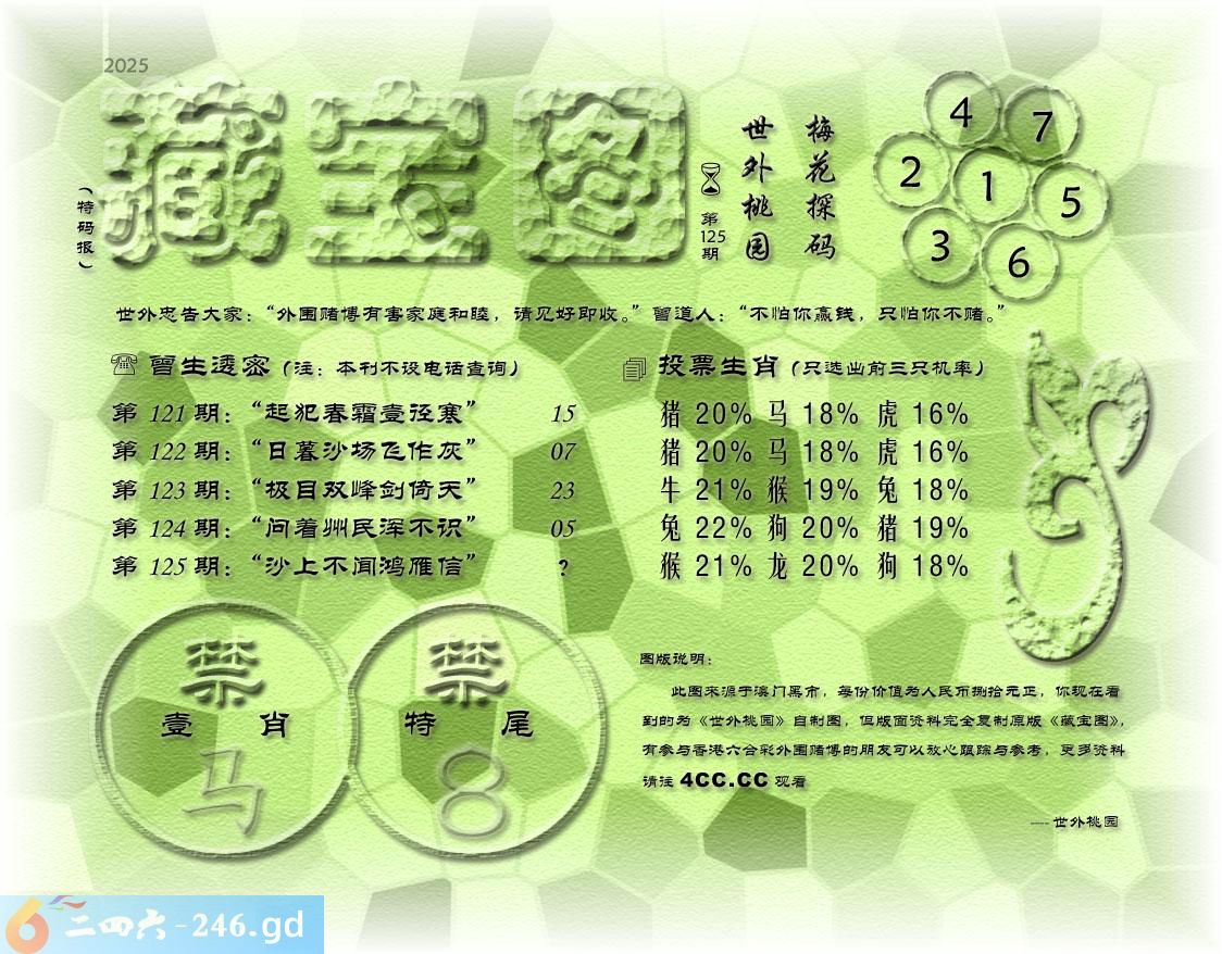 125期藏寶圖 新:合向杨妃冢上生 老:沙上不闻鸿雁信 禁:马禁:8尾玄機字:《溷》