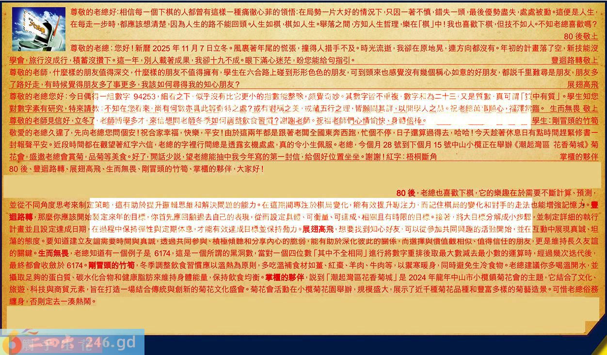 第126期《六合皇信箱文字版》10000%正確!!!正版二四六論壇*精心製作!!! 80後、豐迴路轉、展翅高飛、生而無畏、剛冒頭的竹筍、掌櫃的夥伴,大家好! 【1】.尊敬的老總好:相信每一個下棋的人都曾有這樣一種痛徹心菲的領悟:在局勢一片大好的情況下,只因一著不慎錯失一頭,最後優勢盡失處處被動。這便是人生,在每走一步時,都應該想清楚,因為人生的路不能回頭。人生如棋,棋如人生。舉落之間,方知人生哲理,樂在「棋」中!我也喜歡下棋,但技不如人。不知老總喜歡嗎?80後敬上 〖80後〗:老總也喜歡下棋,它的樂趣在於需要不斷計算、預測,並從不同角度思考來制定策略,這有助於提升邏輯思維和解決問題的能力。在這期間專注於棋局變化,能有效提升專注力,而記住棋局的變化和對手的走法也能增強記憶力。 【2】.尊敬的老總:您好!新曆2025年11月7日立冬。風裏著年尾的慌張,撞得人措手不及。時光流逝,我卻在原地晃,連方向都沒有。年初的計畫落了空,新技能沒學會,旅行沒成行,積蓄沒攒下。這一年,別人載著成果,我卻十九不成。眼下滿心迷茫,盼您能給句指引。豐迴路轉敬上 〖豐迴路轉〗:那麼你應該開始製定來年的目標,你首先應回顧過去自己的表現,從而設定具體、可衡量、可達成、相關且有時限的目標。接著,將大目標分解成小步聚,並制定詳細的執行計畫並且設定達成日期,在過程中保持彈性與定期休息,才能有效達成目標並保持動力。 【3】.尊敬的老師,什麼樣的朋友值得深交,什麼樣的朋友不值得擁有,學生在六合路上碰到形形色色的朋友,可到頭來也感覺沒有幾個稱心如意的好朋友,都說千里難尋是朋友,朋友多了路好走,有時候覺得朋友多了事更多,我該如何尋得我的知心朋友?展翅高飛 〖展翅高飛〗:想要找到知心好友,可以從参加共同興趣的活動開始,並在互動中展現真誠、坦蕩的態度。要知道建立友誼需要時間與真誠,透過共同參與、積極傾聽和分享內心的脆弱,能有助於深化彼此的關係,而選擇與價值觀相似、值得信任的朋友,更是維持長久友誼的關鍵。生而無畏,老總知道有一個例子是6174,這是個所謂的黑洞數,當對一個四位數「其中不全相同」進行將數字重排後取最大數減去最小數的運算時,經過幾次迭代後,最終都會收斂於6174。 【4】.尊敬的老總您好:今日偶得一組數字94253,細看之下,似乎沒有比它更小的指數能整除,頗費奇妙。其数字皆不重複,數字和為二十三,又是質數,真可謂「質中有質」。學生知您對數字素有研究,特來請教不知在您看來,尚有何数亦具此等奇特之處?或有對福之美,或藏五行之理,皆願聞其詳,以開學人之慧。祝老總萬事順心,福澤常臨。生而無畏敬上 〖生而無畏〗:老總知道有一個例子是6174,這是個所謂的黑洞數,當對一個四位數「其中不全相同」進行將數字重排後取最大數減去最小數的運算時,經過幾次迭代後,最終都會收斂於6174。 【5】.尊敬的老師見信好,立冬了,老師博學多才來信想問老師冬季如何調整飲食習慣?謝謝老師。祝福老師們心情愉快,身體倍棒。學生:刚冒頭的竹简 〖剛冒頭的竹筍〗:冬季調整飲食習慣應以溫熱為原則,多吃溫補食材如薑、紅棗、羊肉、牛肉等,以禦寒暖身,同時避免生冷食物。老總建議你多喝溫開水,並攝取足夠的蛋白質、碳水化合物和健康脂肪來維持身體能量,保持飲食均衡。 【6】.敬愛的老總久違了,先向老總您問個安祝合家幸福,快樂,平安!由於這兩年都是跟著老闆全國東奔西跑,忙個不停,日子還算過得去,哈哈!今天趁著休息日有點時間趕緊修書一封報聲平安。近段時間都在觀望著紅字六信,老總的字裡行間總是透露玄機處處,真的令小生佩服。老總,今個月28號到下個月15號中山小欖正在舉辦《潮起灣區花香菊城》菊花會,盛邀老總會賞菊,品菊等美食。好了,閒話少說,望老總能抽中我今年寫的第一封信,給個好位置坐坐。謝謝!紅字:梧桐斷角掌櫃的夥伴 〖掌櫃的夥伴〗:說到「潮起灣區花香菊城」是2024年龍年中山市小欖鎮菊花會的主題,它結合了文化、旅遊、科技與商貿元素,旨在打造一場結合傳統與創新的菊花文化盛會。菊花會活動在小欖菊花園舉辦,規模盛大,展示了近千種菊花品種和豐富多樣的菊藝造景。可惜老總俗務纏身,否則定去一湊熱鬧。 紅字:觸手生花 暗码:02062738 [释义]形容技艺高超神奇,一动手即呈现盎然生机。 [出处]清·赵翼《瓯北诗话·李青莲诗》;“然以杜韩与之比较,一则用力而不免痕迹,一则不用力而触手生春:此仙与人之别也。”