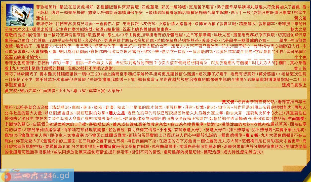 〖粵智〗:九方大師這個欄目不在三報內,你首先登入了《創富網》的主畫面,在三報的位置下面是五欄,再把頁面向下拉,在版面的右下方最後一個位置便是九方大師。這個欄目是在開彩當天才會更新,而且經常四個尾數中特,要累積滿500分才能看得到。