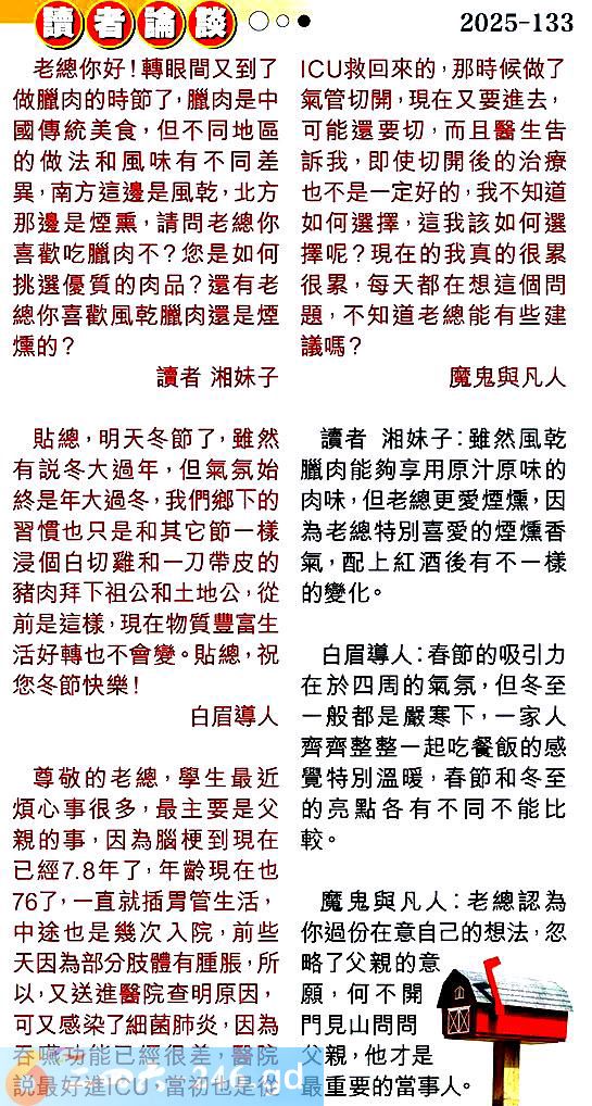 第一三三期讀者論談 1.老總你好!轉眼間又到了做臘肉的時節了,臘肉是中國傳統美食,但不同地區的做法和風味有不同差異,南方這邊是風乾,北方那邊是煙熏,請問老總你喜歡吃臘肉不?您是如何挑選優質的肉品?還有老總你喜歡風乾臘肉還是煙燻的?讀者湘妹子 〖讀者湘妹子〗:雖然風乾臘肉能夠享用原汁原味的肉味,但老總更爱煙燻,因為老總特別喜爱的煙燻香氣,配上紅酒後有不一樣的變化。 2.貼總,明天冬節了,雖然有說冬大過年,但氣氛始終是年大過冬,我們鄉下的習慣也只是和其它節一樣浸個白切雞和一刀帶皮的豬肉拜下祖公和土地公,從前是這樣,現在物質豐富生活好轉也不會變。貼總,祝您冬節快樂!白眉導人 〖白眉導人〗:春節的吸引力在於四周的氣氛,但冬至一般都是嚴寒下,一家人齊齊整整一起吃餐飯的感覺特別溫暖,春節和冬至的亮點各有不同不能比較。 3.尊敬的老總,學生最近煩心事很多,最主要是父親的事,因為腦梗到現在已經7.8年了,年齡現在也76了,一直就插胃管生活,中途也是幾次入院,前些天因為部分肢體有腫脹,所以又送進醫院查明原因,可又感染了細菌肺炎,因為吞嗫功能已經很差,醫院說最好進,當初也是從救回來的,那時候做了氣管切開,現在又要進去,可能還要切,而且醫生告訴我,即使切開後的治療也不是一定好的,我不知道如何選擇,這我該如何選擇呢?現在的我真的很累很累,每天都在想這個問題,不知道老總能有些建議嗎?魔鬼與凡人 〖魔鬼與凡人〗:老總認為你過份在意自己的想法,忽略了父親的意願,何不開門見山問問父親,他才是最重要的當事人。