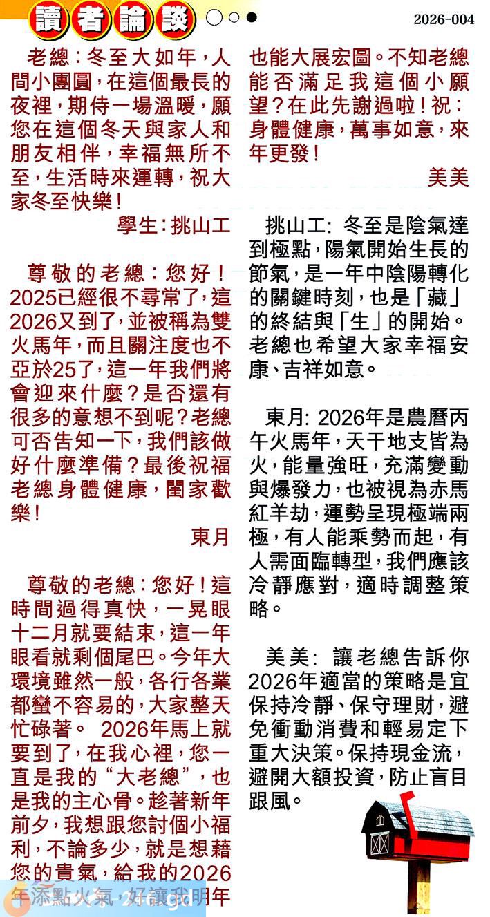 第004期讀者論談 1.老總:冬至大如年,人間小團圆,在這個最長的夜裡,期侍一場溫暖,願您在這個冬天與家人和朋友相伴,幸福無所不至,生活時來運轉,祝大家冬至怏樂!學生:挑山工 〖挑山工〗:冬至是陰氣達到極點,陽氣開始生長的節氣,是一年中陰陽轉化的關键時刻,也是「藏」的終結與「生」的開始。老總也希望大家幸福安康、吉祥如意。 2.尊敬的老總:您好!2025已經很不尋常了,這2026又到了,並被稱為雙火馬年,而且關注度也不亞於25了,這一年我們將會迎來什麼?是否還有很多的意想不到呢?老總可否告知一下,我們該做好什麼準備?最後祝福老總身體健康,閏家歡樂!東月 〖東月〗:2026年是農暦丙午火馬年,天干地支皆為火,能量強旺,充滿變動與爆發力,也被視為赤馬紅羊劫,運勢呈現極端兩極,有人能乘勢而起,有人需面臨轉型,我們應該冷靜應對,適時調整策略。 3.尊敬的老總:您好!這時間過得真快,一晃眼十二月就要結束,這一年眼看就剩個尾巴。今年大環境雖然一般,各行各業都蟄不容易的,大家整天忙碌著。2026年馬上就要到了,在我心裡,您一直是我的“大老總”,也是我的主心骨。趁著新年前夕,我想跟您討個小福利,不論多少,就是想藉您的貴氣,給我的2026年添點火氣,好讓我明年也能大展宏圖。不知老總能否滿足我這個小願望?在此先謝過啦!祝:身體健康,萬事如意,來年更發!美美 〖美美〗:讓老總告訴你2026年適當的策略是宜保持冷靜、保守理財,避免衝動消費和輕易定下重大決策。保持現金流,避開大額投資,防止盲目跟風。