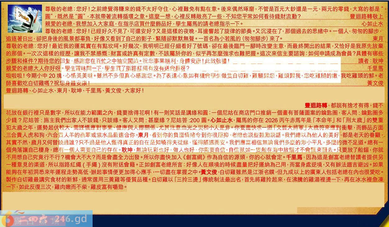 第004期《六合皇信箱文字版》10000%正確!!!正版二四六論壇*精心製作!!! 豐迴路轉、心如止水、東月、耿坤、千里馬、黃文俊,大家好! 【1】.尊敬的老總:您好!之前總覺得赚來的錢不太好守住,心裡難免有點在意。後來偶然琢磨,不管是百元大鈔還是一元、兩元的零錢,大寫的都是“圓”,既然是“圓”,本就带著流轉循環之意。這麼一想,心裡反轉敞亮了一些,不知您平常如何看待錢財流動?豐迴路轉敬上 〖豐迴路轉〗:都説有捨才有得,錢不花放在銀行裡只是數字,所以在能力範圍之內,錢要捨得花啊!有一則笑話是講緣和圆:一個尼姑在商店門口推銷一個畫有菩薩圆案的鑰匙圈,客人問:鑰匙圈多少錢?尼姑答:施主我們出家人不談錢,只談緣。客人又間:甚麼緣?尼姑答:200圆。 【2】.親愛的老總,我想加入大家庭,在指示店買什麼飾品好,學生屬馬的請老總指示一下。心如止水 〖心如止水〗:屬馬的你在2026丙午赤馬年是「本命年」和「刑太歲」的雙重犯太歲之年,運勢起伏較大,需謹慎應對事業、健康與人際關係,尤其注意血光之災和小人是非。你要盡快求一道「文哲大將軍」太歲符來應對衝撃,而飾品方面三合貴人虎和狗,六合貴人羊的翡翠或紫水晶最適合你。 【3】.尊敬的老總:您好!已經好久不見了,可還安好?又是這樣的夜晚,耳邊響起了旋律的節奏。又沉浸在了,那個過去的思緒中。一個人,匆匆的腳步,追逐著日出,卻把身後的風景都辜負,好像又看到了自己的影子,緊隨卻默默無聲。一首名為小若風的(匆匆腳步)來了。東月 〖東月〗:看到你的負面情緒令到你很壓抑,老總也説些鼓勵説話。我們總以為他人的美好,都是老天的眷顧,其實不然,歲月又何曾饒過誰?只不過是他人懂得真正的自在是知曉得失從緣,懂得隨遇而安。我們應當相信無論我們多麼的渺小平凡,多麼的微不足道。總有一個角落讓自己棲身,總有一個人需要自己的存在。 【4】.尊敬的老總:您好!最近我的運氣實在有點坎坷。好幾次,我明明已經仔細看好了號碼,卻在最後臨門一腳時改變主意,而最終開出的結果,又恰好是我原先放棄的那個。一次次這樣的經歷,讓我不禁感慨:財富或許真有定數,不該屬於你的,似乎再怎麼強求也難把握。這次來信主要諮詢:如何申請成為會員?具體有哪些步驟和條件?期待您的回复,感謝您在百忙之中抽空閲讀。祝您事業順利身體安康!吡此致敬禮!讀者:耿坤 〖耿坤〗:無論玩彩也好做人也好,你需要自信,自信就如一隻船在海中放錨才不會飄來飄去。只要放了船錨,你就不用想自己究竟行不行?機會大不大?而是會盡全力出發。所以你盡快加入《創富網》作為自信的源頭,你的心就會定。 【5】.親愛的老總大人你好呀。學生冒昧問一下,學生買了指路紅縄有沒有送會員呀?千里馬 〖千里馬〗:因為這是創富老總替讀者提供另一種意見的渠道,所以指路紅繩(手繩)沒有附送會籍。正如創富老總所言:好像人在順境的時候盡量把好運納為己用,而當身處逆境,又有辦法趨吉避凶。如果能夠在年初洞悉來年運程走勢高低,辦起事情便更加得心應手,一切盡在掌握之中。 【6】.啦啦啦!今期小中20塊,心情美美噠。雖然不多但真心感謝您。為了表達心意如有機會學生微隻白切雞,雞腿歸您雞頭歸我,您吃雞腿的嫩,我吃雞頭的鮮。老師喜歡吃白切雞嗎?祝您身體安康!黃文俊 〖黄文俊〗:白切雞雖然是江浙名饌,但九成以上的廣東人包括老總在內也很愛吃。製作白切難最講究食材的新鮮,通常選用三黃雞等優質品種。白切雞以「三拎三燙」傳統制法最出名,首先將雞拎起來,在沸騰的雞湯裡浸一下,再在冰水裡急凍一下,如此反復三次,雞肉嫩而不柴,雞皮富有嚼勁。 紅字:獨佔鰲頭 暗码:01253749 [释义]鳌头:宫殿门前台阶上的鳌鱼浮雕,科举进士发榜时状元站此迎榜。科举时代指点状元。比喻占首位或第一名。 [出处]元·无名氏《陈州粜米》楔子:“殿前曾献升平策,独占鳌头第一名。”