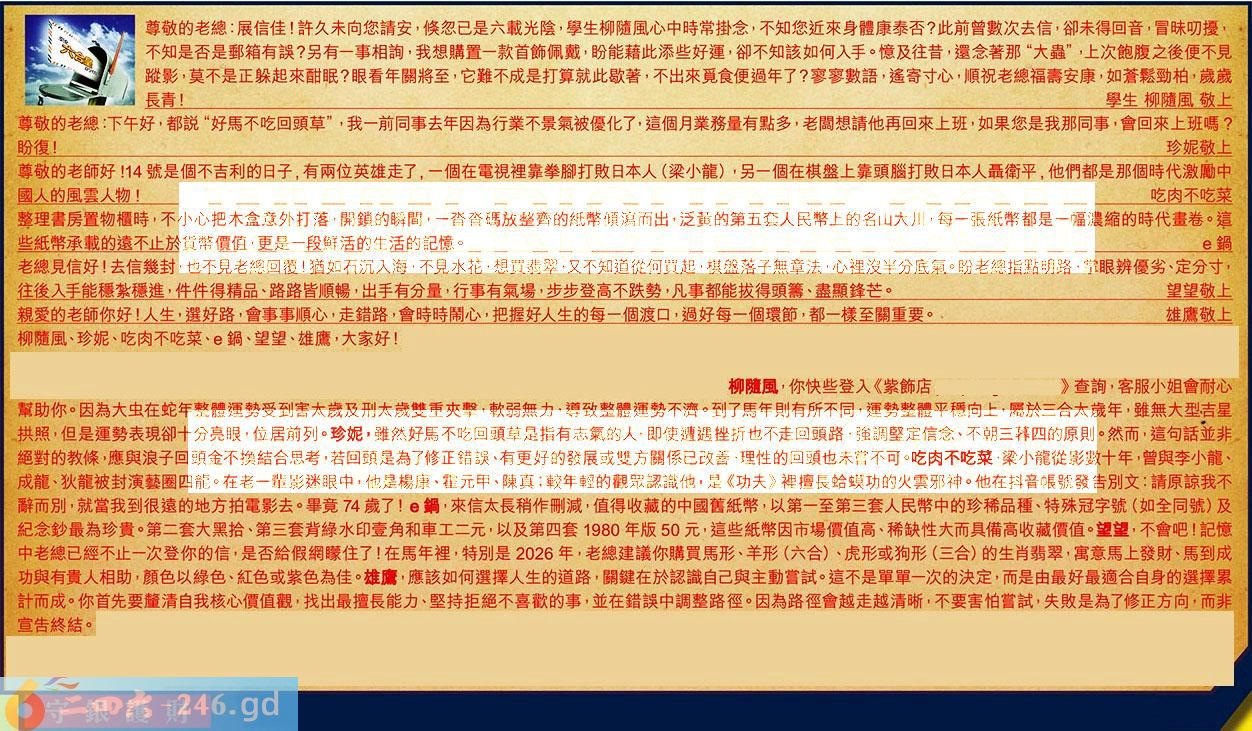 〖望望〗:不會吧!記憶中老總已經不止一次登你的信,是否給假網朦住了!在馬年裡,特别是2026年,老總建議你購買馬形、羊形((六合)、虎形或狗形(三合)的生肖翡翠,寓意馬上發財、馬到成功與有貴人相助,顔色以緑色、紅色或紫色為佳。