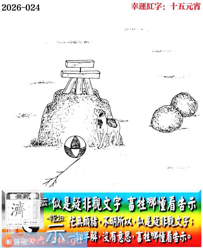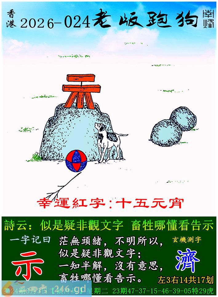 024期老版跑狗一字記之曰:【示】 詩雲:似是疑非觀文字,畜牲哪懂看告示。 茫無頭緒,不明所以,似是疑非觀文字; 一知半解,沒有意思,畜牲哪懂看告示。 玄機測字:《濟》