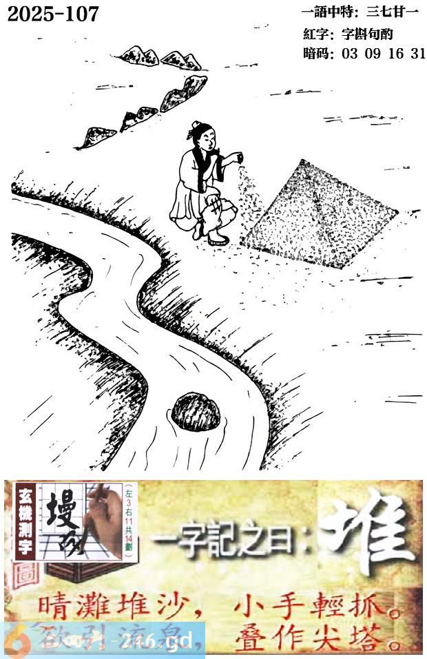 107期新版跑狗一字記之曰:【堆】 晴灘堆沙,小手輕抓。 慾引流泉,疊作尖塔。 玄機測字:【墁】 一語中特:三七甘一