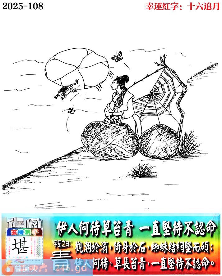 108期老版跑狗一字記之曰:【青】 詩雲:伊人何待草苔青,一直堅持不認命。 觀潮於濱,倚身於石,蜘蛛結網堅而碩; 伊人何待,草長苔青,一直堅持不認命。 玄機測字:《堪》