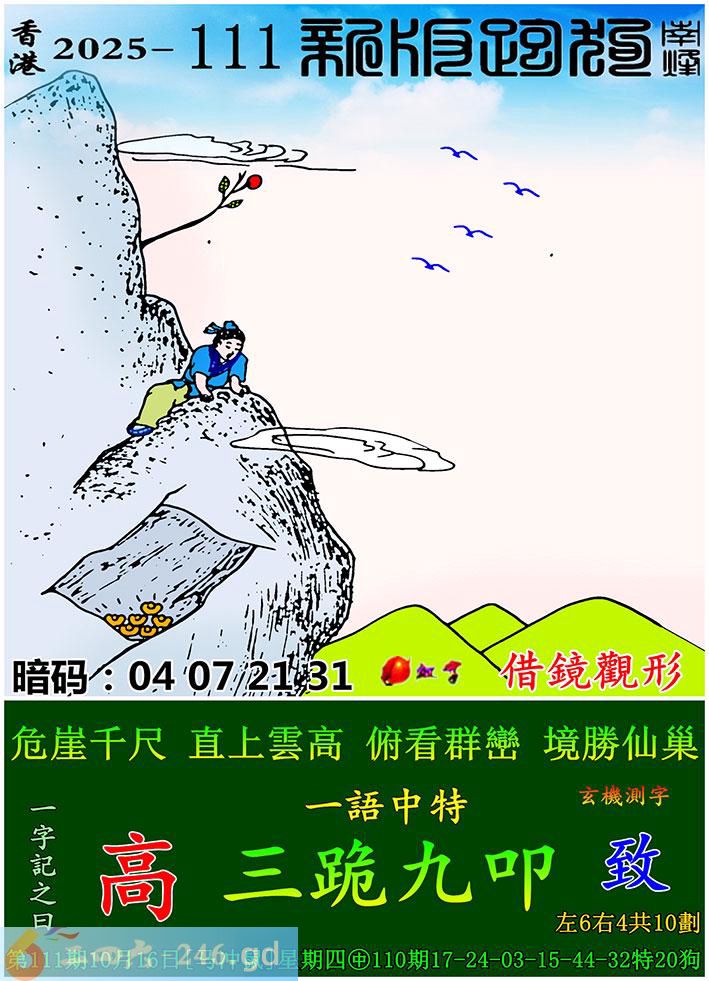111期跑狗一字記之曰:【高】 危崖千尺,直上雲高。 俯看群巒,境勝仙巢。 玄機測字:【致】 一語中特:三跪九叩