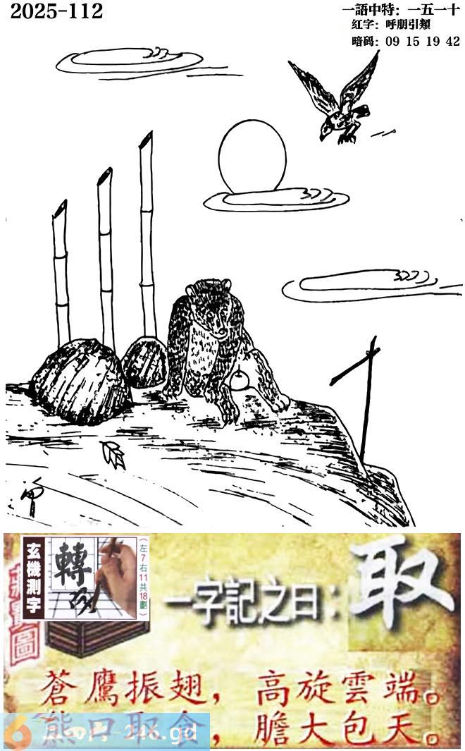112期跑狗一字記之曰:【取】 蒼鷹振翅,高旋雲端。 熊口取食,膽大包天。 玄機測字:《轉》 一語中特:一五一十
