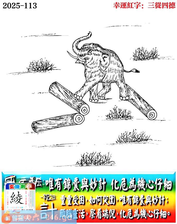 113期老版跑狗一字記之曰:【計】 詩雲:唯有錦囊與妙計,化危為機心仔細。 重重受困,如何突圍,唯有錦囊與妙計; 頭腦靈活,察看端倪,化危為機心仔細。 玄機測字:《綾》