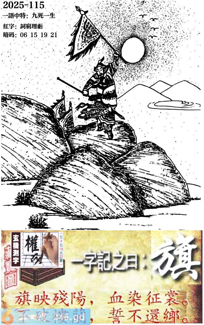 115期跑狗一字記之曰:【旗】 旗映殘陽,血染征裳。 不破樓蘭,誓不還鄉。 玄機測字:《權》 一語中特:九死一生