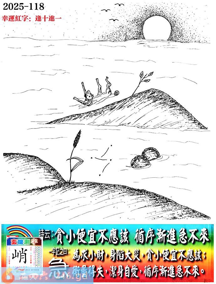 118期老版跑狗一字記之曰:【急】 詩雲:貪小便宜不應該,循序漸進急不來。 為求小財,身䧟大災,貪小便宜不應該; 衡量得失,潔身自愛,循序漸進急不來。 玄機測字:《峭》
