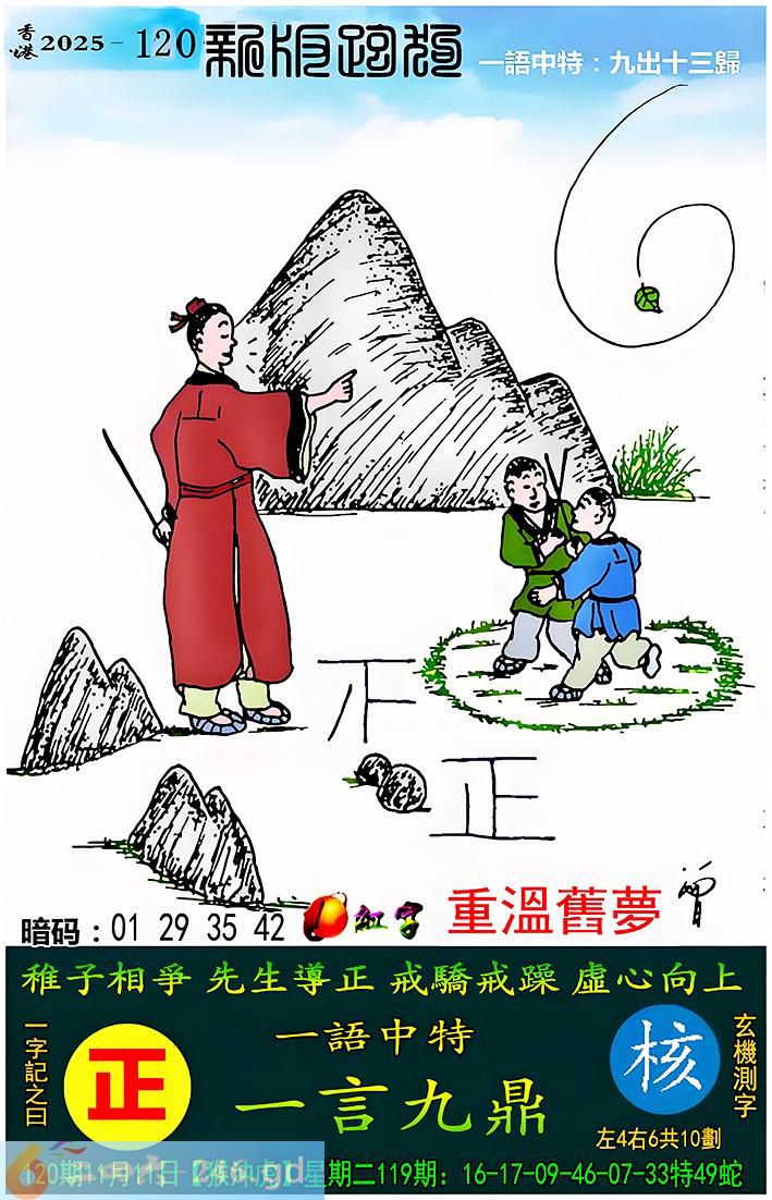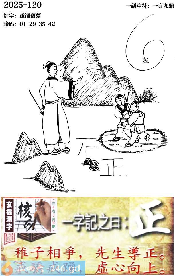 120期跑狗一字記之曰:【正】 稚子相爭,先生導正。 戒驕戒躁,虛心向上。 玄機測字:《核》 一語中特:一言九鼎