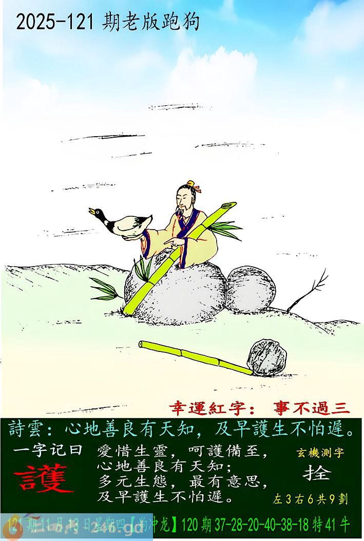 121期老版跑狗一字記之曰:【護】 詩雲:心地善良有天知,及早護生不怕遲。 愛惜生靈,呵護備至,心地善良有天知; 多元生態,最有意思,及早護生不怕遲。 玄機測字:《拴》