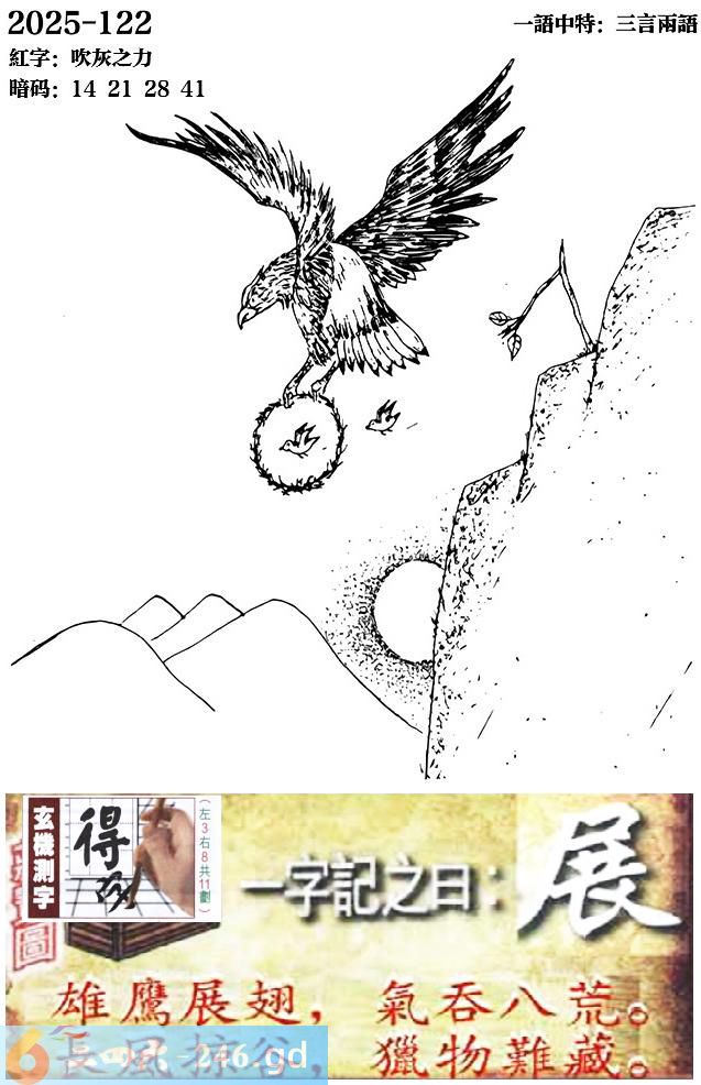 122期跑狗一字記之曰:【展】 雄鷹展翅,氣吞八荒。 長風掠谷,獵物難藏。 玄機測字:《得》 一語中特:三言兩語