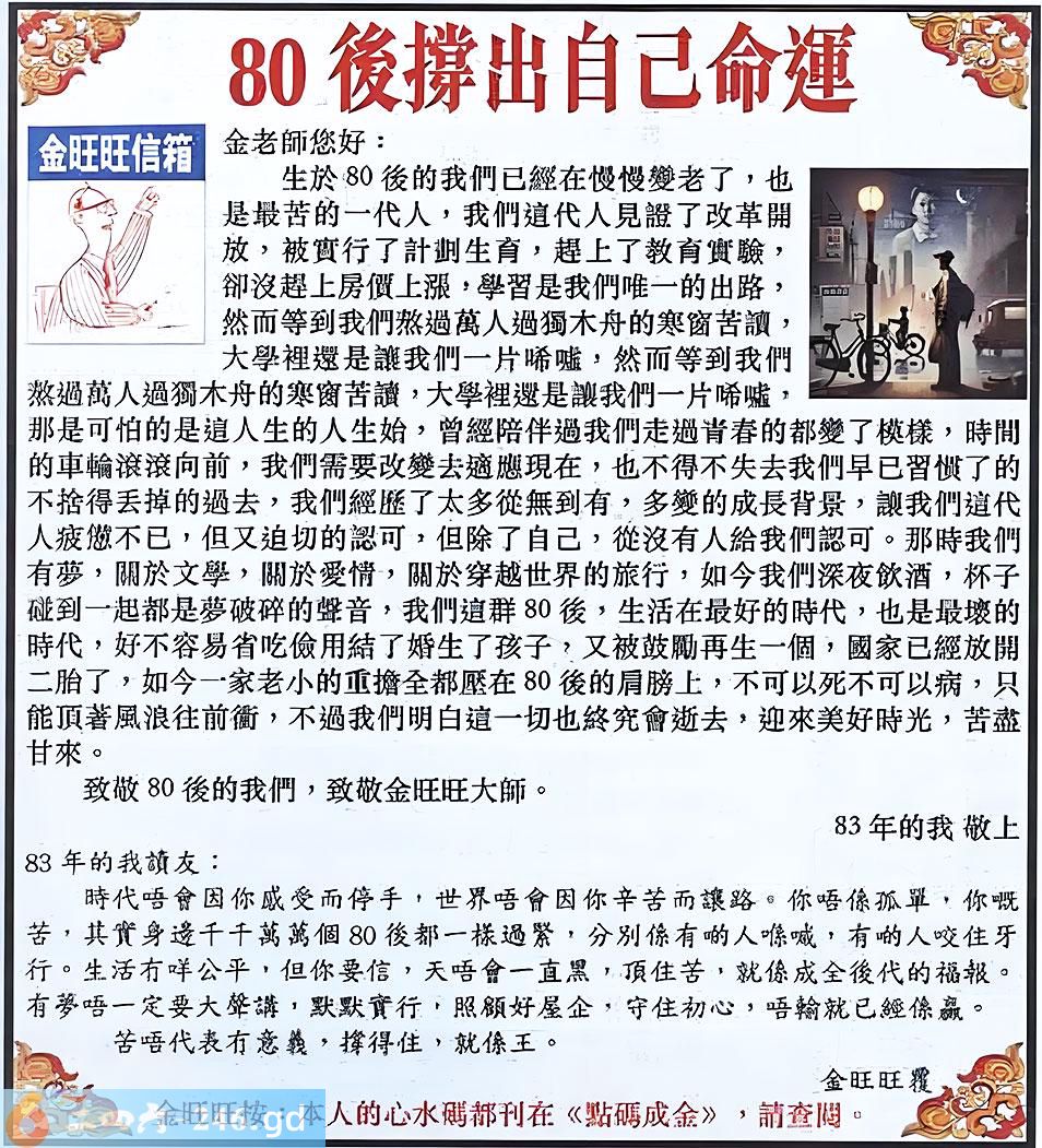 六合彩122期:金旺旺信箱彩民推荐→→《80 後撐起自己命運》