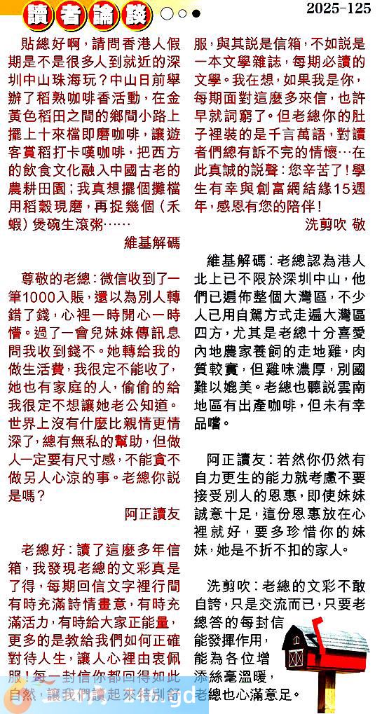 3.老總好:讀了這麼多年信箱,我發現老總的文彩真是了得,每期回信文字裡行間有時充滿詩情畫意,有時充滿活力,有時給大家正能量,更多的是教給我們如何正確對待人生,讓人心裡由衷佩服!每一封信你都回得如此自然,讓我們讀起來特別舒服,與其說是信箱,不如說是一本文學雜詵,每期必讀的文學。我在想,如果我是你,每期面對這麼多來信,也許早就詞窮了。但老總你的肚子裡装的是千言萬語,對讀者們總有訴不完的情懷...在此真誠的說聲:您辛苦了!學生有幸與創富網結緣15週年,感恩有您的陪伴!洗剪吹敬