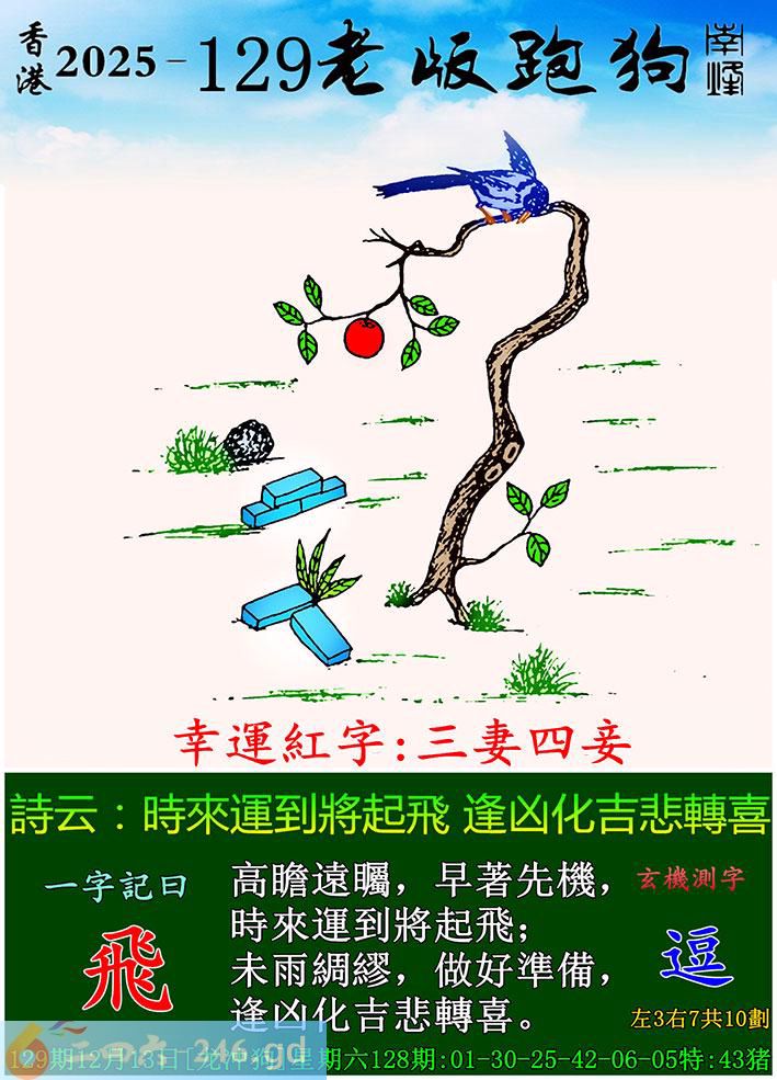 129期老版跑狗一字記之曰:【飛】 詩雲:時來運到將起飛,逢凶化吉悲轉喜。 高瞻遠矚,早著先機,時來運到將起飛; 未雨綢繆,做好準備,逢凶化吉悲轉喜。 玄機測字:《逗》