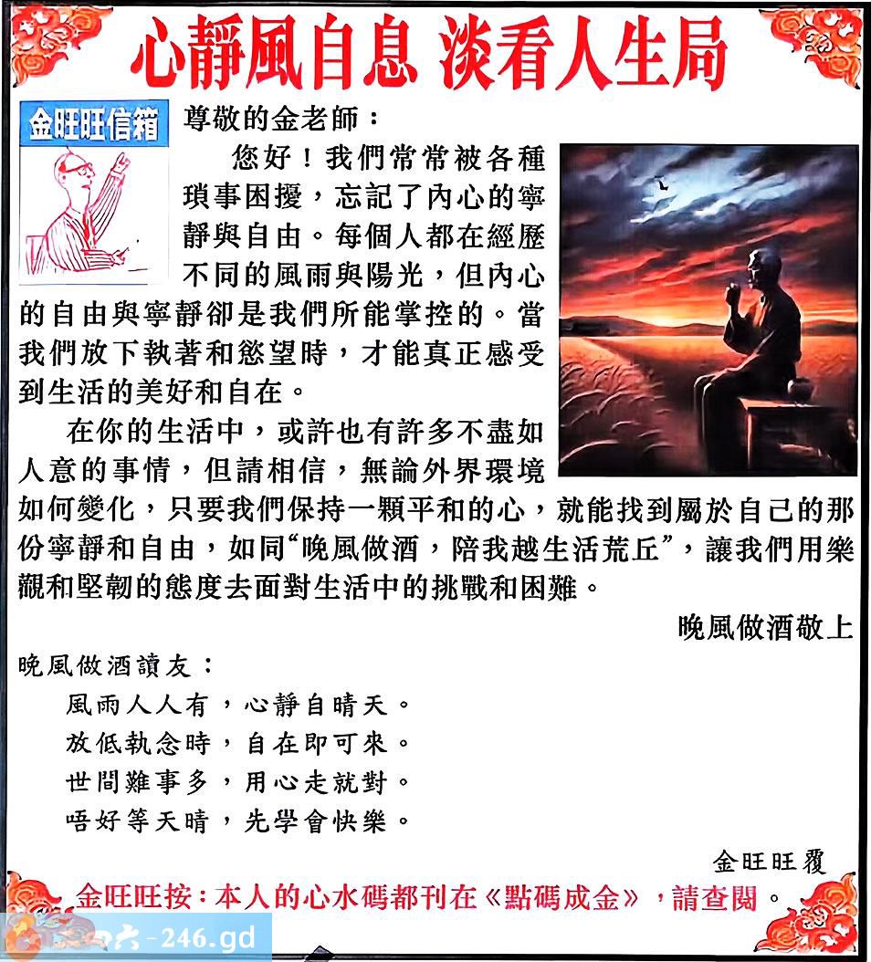 六合彩130期:金旺旺信箱彩民推荐→→《心靜風自息 淡看人生局》