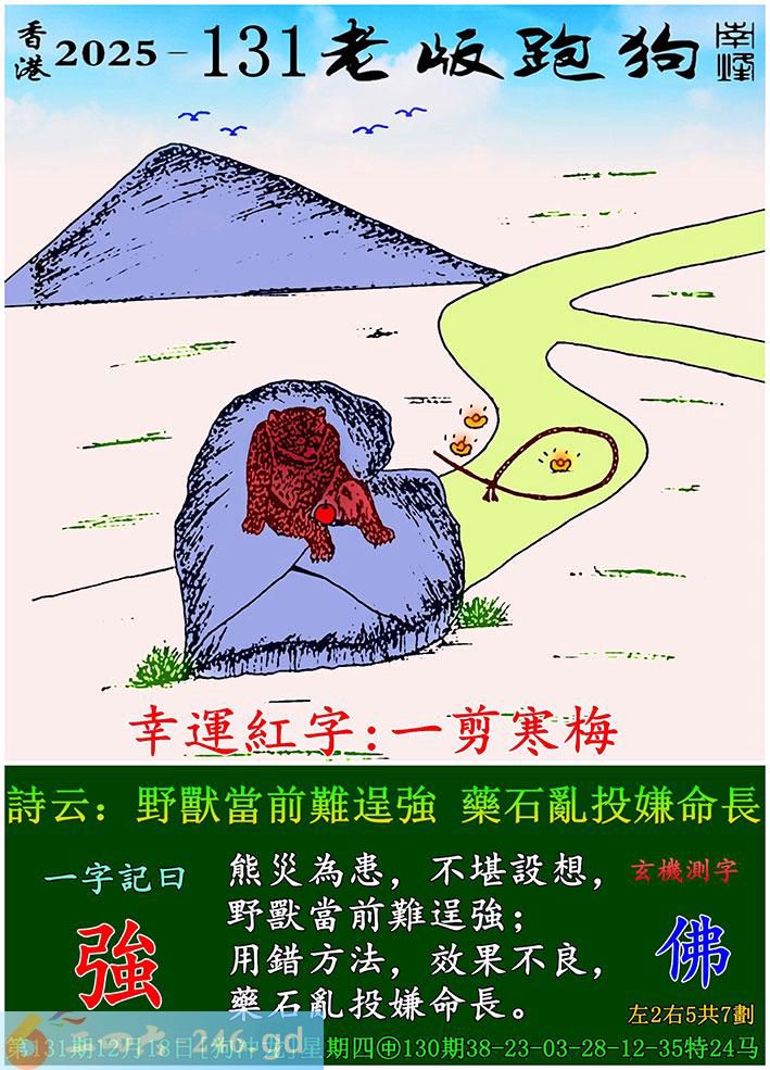 131期老版跑狗一字記之曰:【強】 詩雲:野獸當前難逞強,藥石亂投嫌命長。 熊災為患,不堪設想,野獸當前難逞強; 用錯方法,效果不良,藥石亂投嫌命長。 玄機測字:《佛》