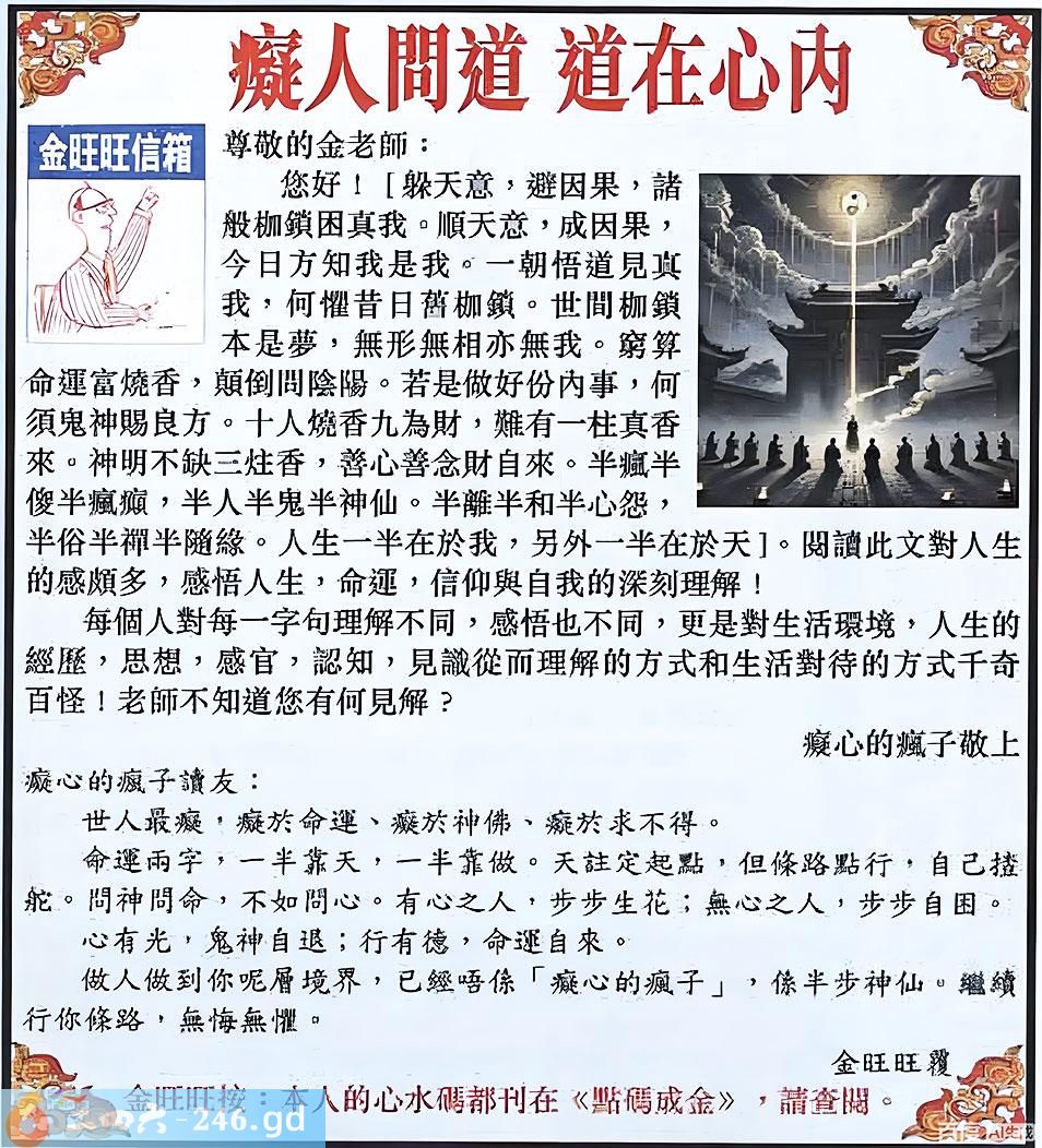 六合彩133期:金旺旺信箱彩民推荐→→《癡人問道 道在心內》