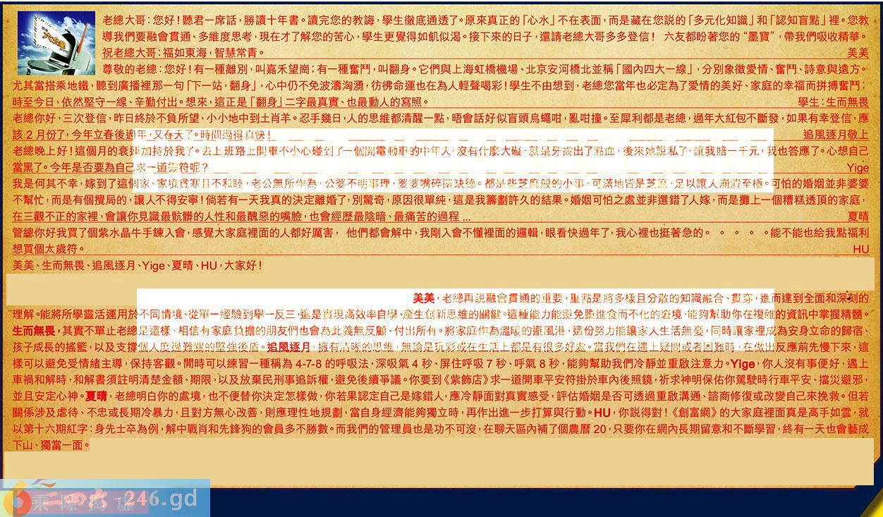 【1】.老總大哥:您好!聽君一席話,勝讀十年書。讀完您的教梅,學生徹底通透了。原來真正的「心水」不在表面,而是藏在您説的「多元化知識」和「認知盲點」裡。您教導我們要融會貫通、多維度思考,現在才了解您的苦心,學生更覺得如飢似渴。接下來的日子,還請老總大哥多多登信!六友都盼著您的“墨寶”,帶我們吸收精華。祝老總大哥:福如東海,智慧常青。美美
