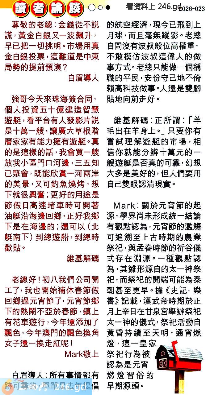 3.老總好!初八我們公司開工了,我也開始補休春節假回郷過元宵節了,元宵節鄉下的熱鬧不亞於春節,鎮上有花車遊行,今年還添加了飘色,今年澳門的飄色換角女子還一換走紅呢!敬上